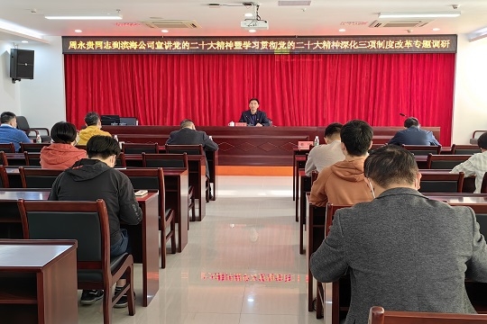 12月8日上午,市城投集團(tuán)黨委書記、董事長周永貴到掛點(diǎn)聯(lián)系的下屬濱海公司宣講黨的二十大精神,并就學(xué)習(xí)貫徹黨的二十大精神深化三項制度改革開展專題調(diào)研。濱海公司全體黨員干部職工參加宣講會及專題調(diào)研。周永貴結(jié)...